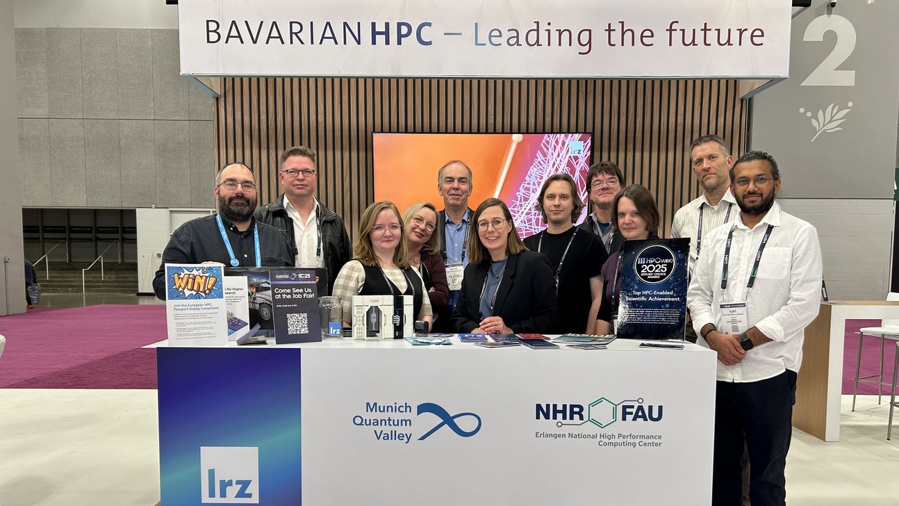 Zum vierten Mal war Munich Quantum Valley zusammen mit der Technischen Universität München (TUM), der Ludwig-Maximilians-Universität München (LMU) und dem Nationalen Hochleistungsrechenzentrum Erlangen (NHR@FAU) am Stand des Leibniz-Rechenzentrums (LRZ) auf der SC25 dabei. Der gemeinsame Stand war der perfekte Ort, um mit den Besuchern über Hochleistungs- und Quantencomputing sowie deren Integration in das bayerische Quantenökosystem zu quatschen.